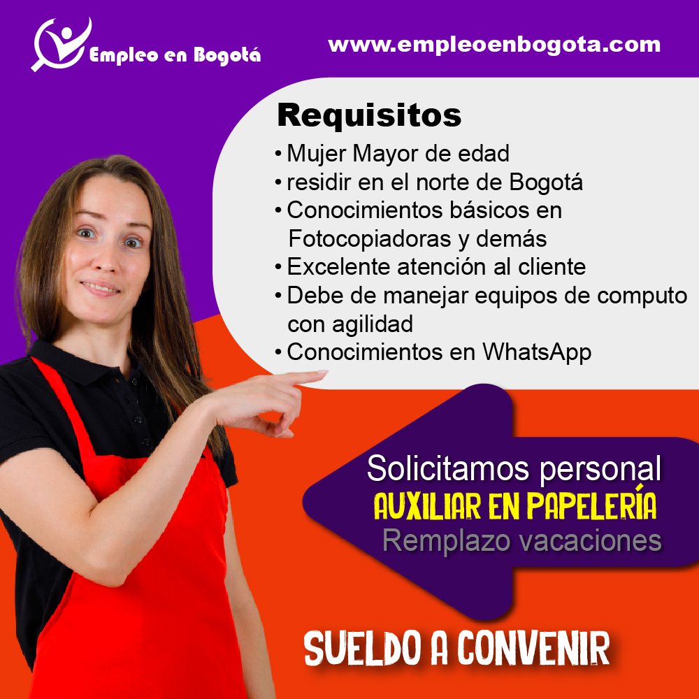 El aspirante al cargo debe de ser preferiblemente mujer mayor de edad , tener conocimientos básicos en manejo de fotocopiadoras, equipos de computo, WhatsApp, debe contar con buena atención al cliente, el tipo de contrato es por un mes, para el remplazo de vacaciones.